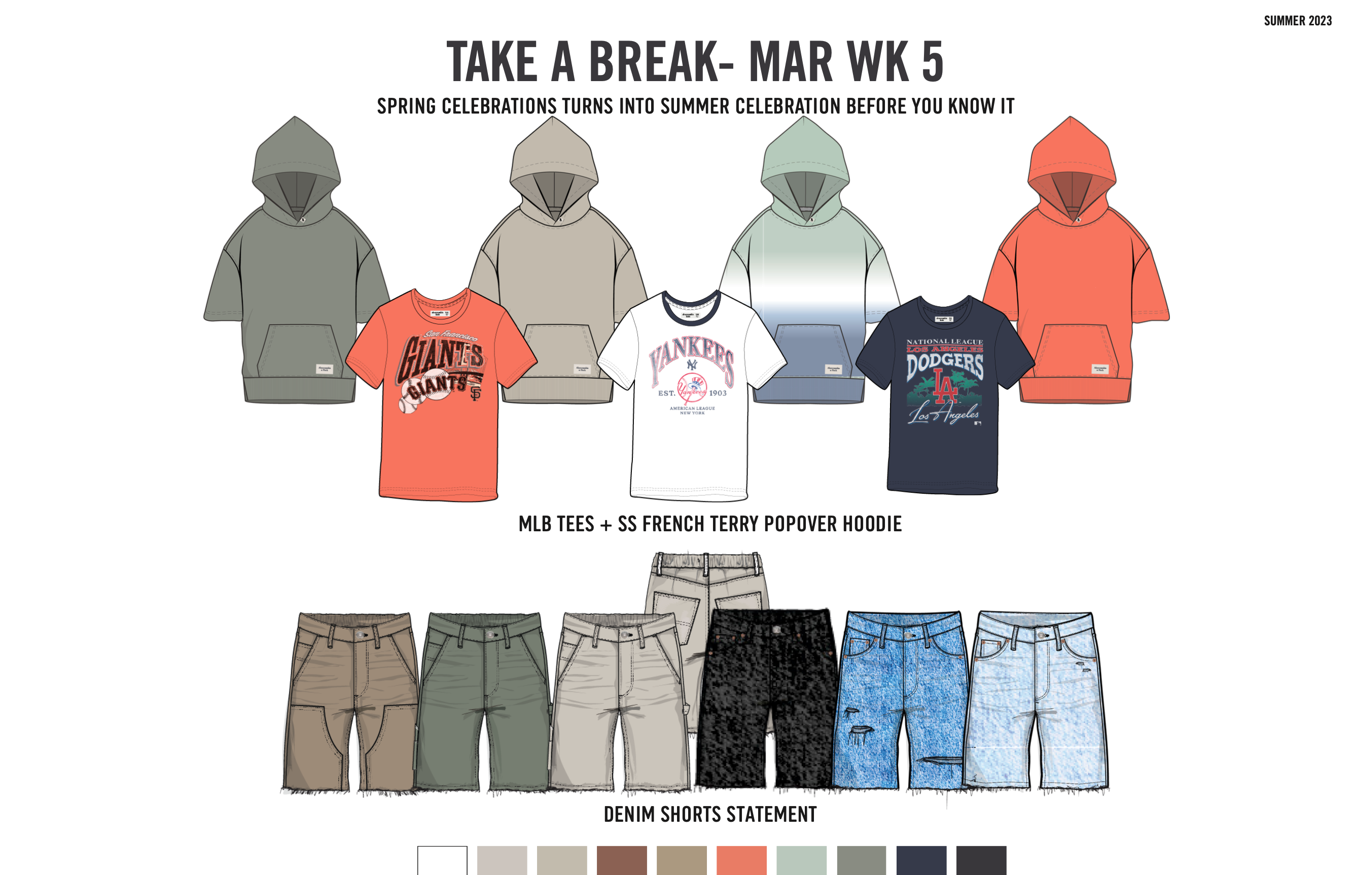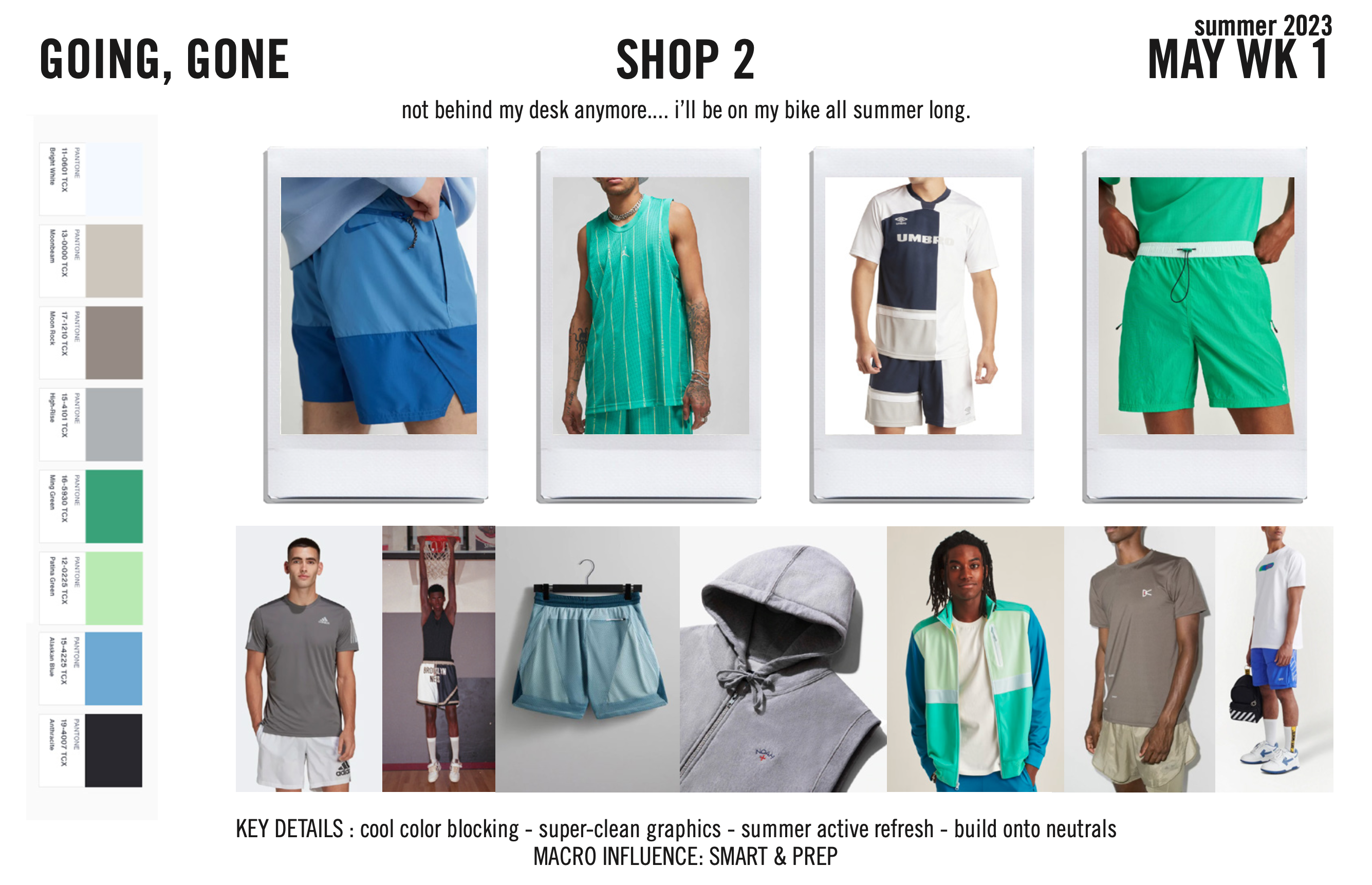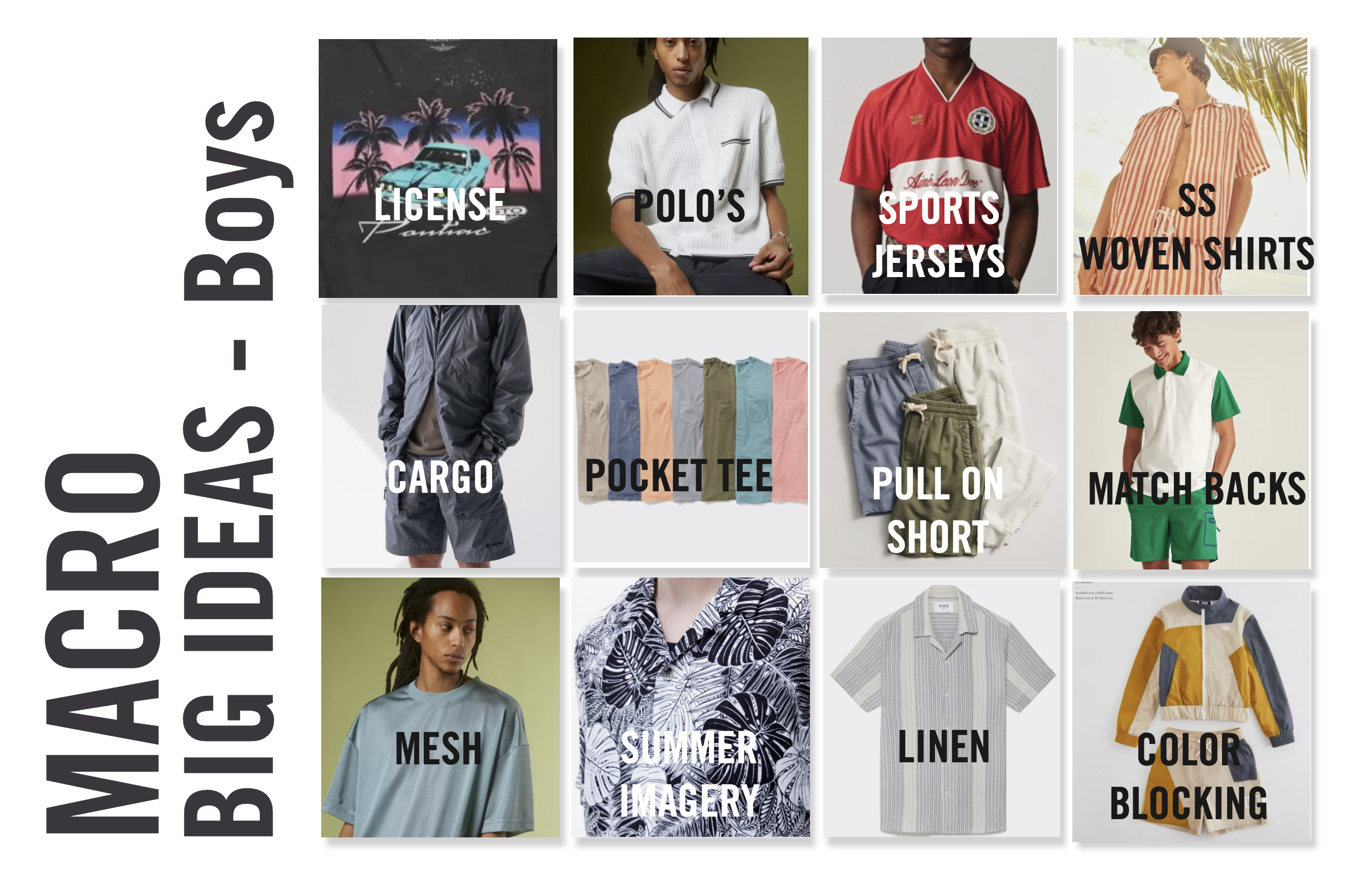 our concept team equipped us with relevant macro trends that are woven throughout the themes, key items, outfits and assortment. the heavy hitters we’re passionate about are licensing, sports jerseys, pull on shorts and matchbacks.