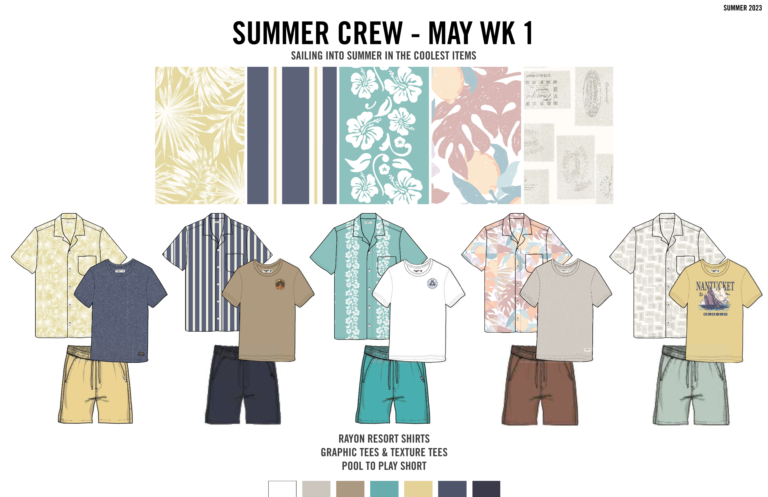 our second theme focused on swim and resort-wear. one of the ‘uniforms’ of the summer for our kid is swim shorts and a top, usually a tee. swim is a big deal; we start designing it very early in spring, create a massive swim shop, and this year, we introduced an incredible new swim fabric in addition to our ‘pool to play’ nylon fabric. to go with the swim assortment, i made sure we gave our kid easy tops that nod to the trends such as destination graphic tees, summer-centric licensing and lightweight resort shirts.