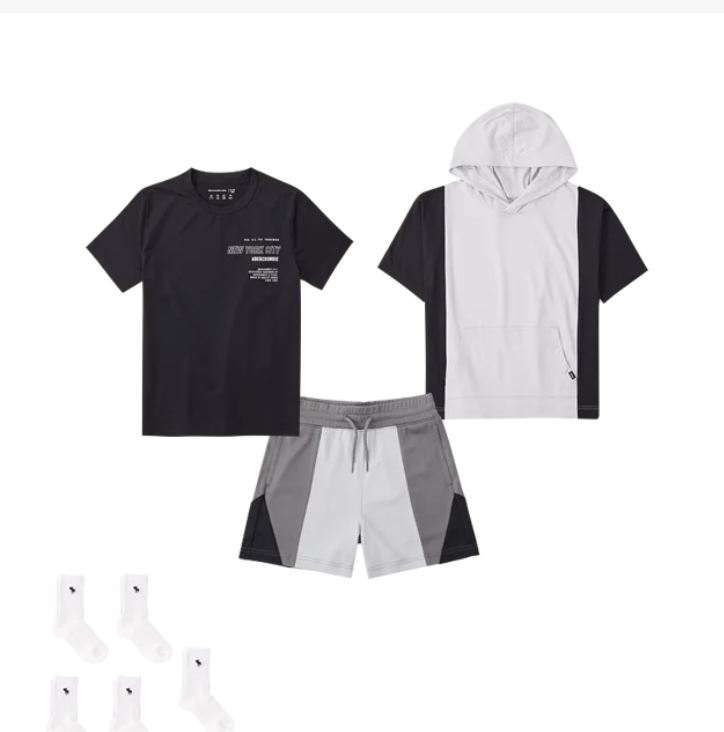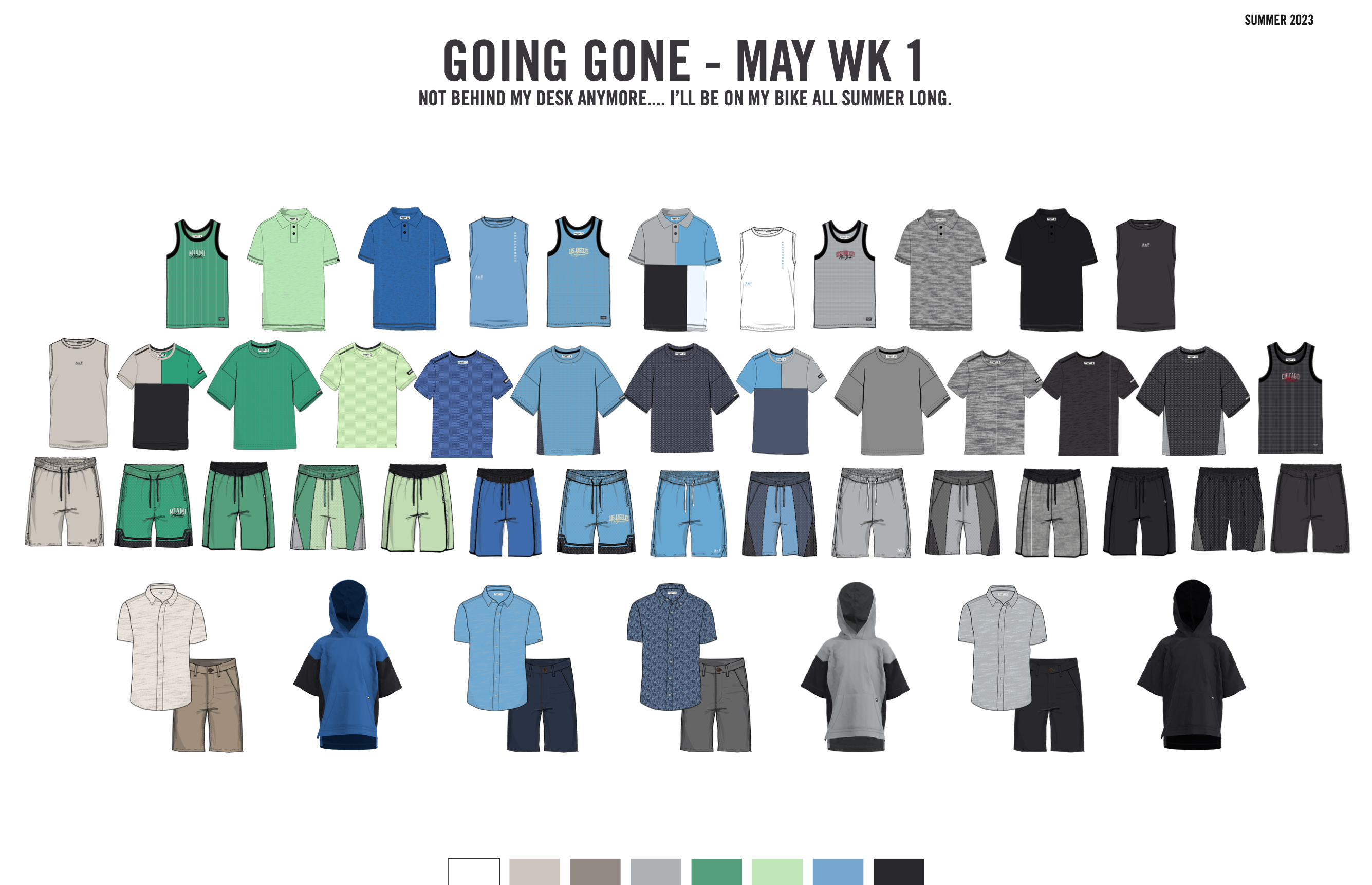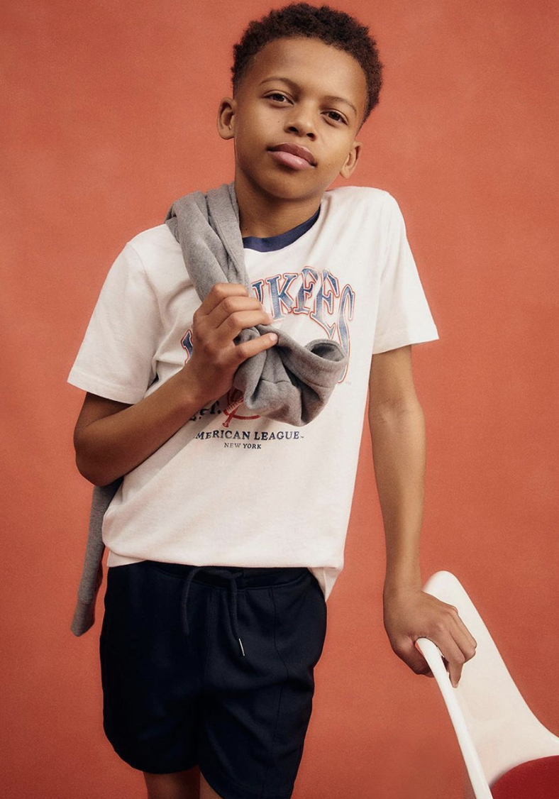 our last theme focused on the most dominant and important type of clothing in their wardrobe- active. we know they LIVE in active during the summer. think comfy enough to lounge around and play video games in, but cool and lightweight to ride their bikes to their friends' house in the blazing sun. there are lots of players and go-to brands in the active market, but we pushed forth to design an assortment with aged-up branding and graphics, a trendy sports- angle with bloke-core jerseys and mesh fabrications, and mix-and-match elevated essentials.