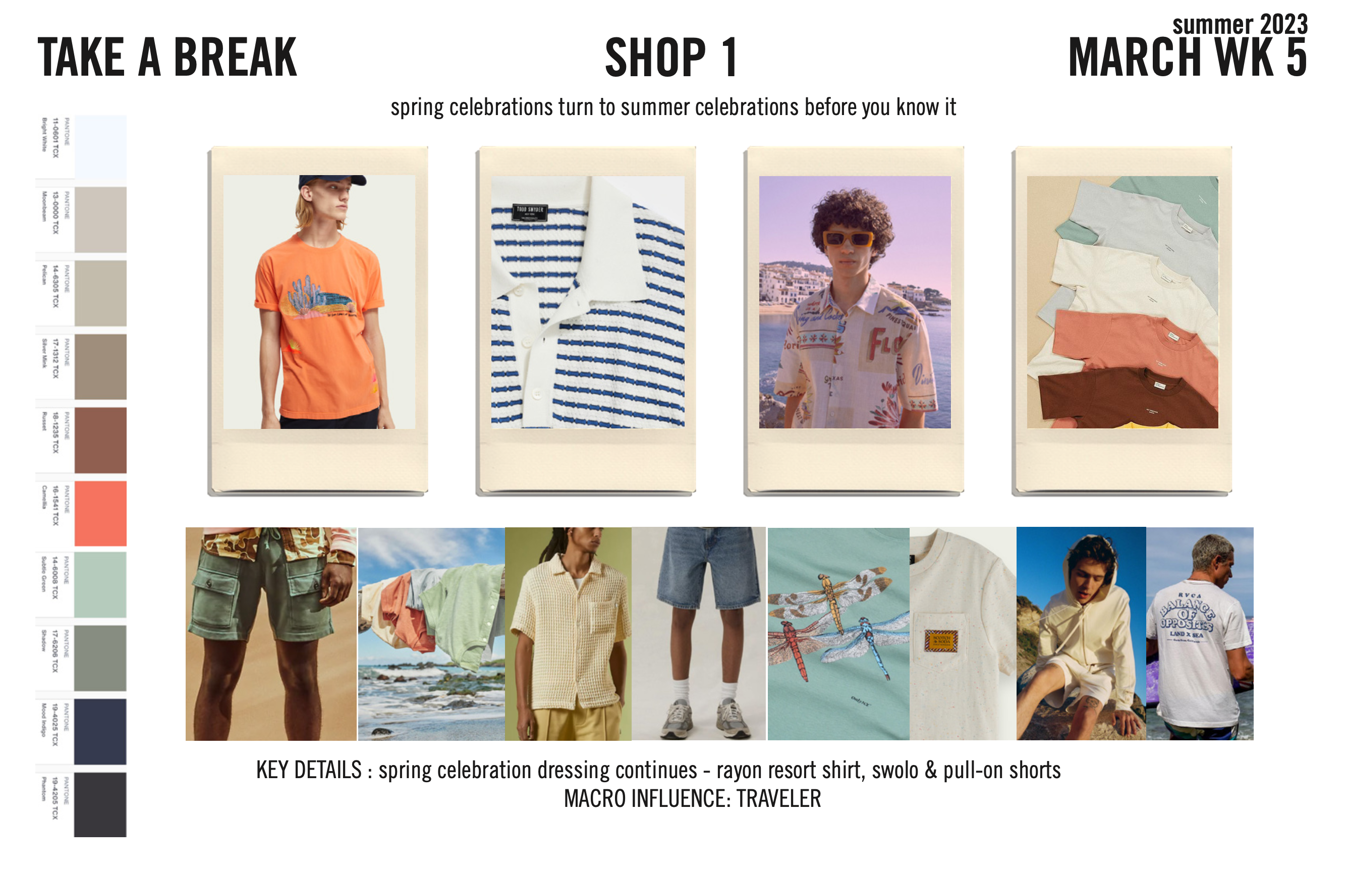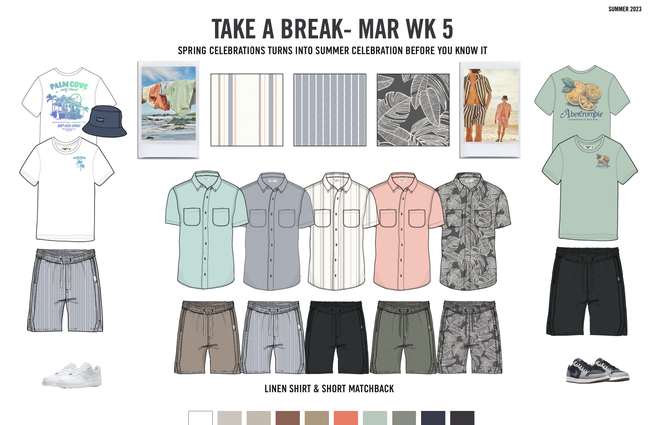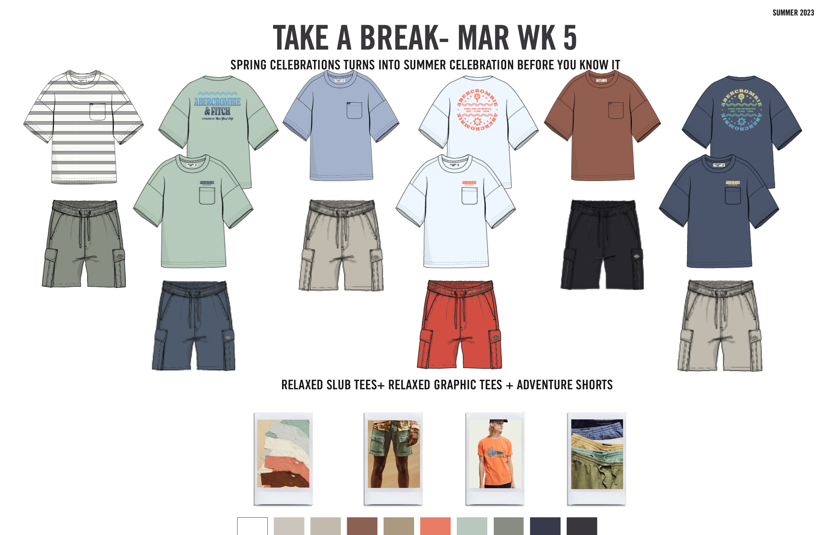 ‘take a break’ was our intro to summer 2023 and where we envisioned a drop of ‘fashion’ for our kid. the timeframe is near easter and graduation and signals a need for cool and comfy dress up and/or fashion items. think collared shirts and clean shorts, trendy licensing tees and denim shorts. i loved getting behind the trend of matching shirt + shorts sets, camp collar linen shirts, light weight sweater polos, nylon shorts and sports licensed tees. the key is translating adult trends into wearable and easy versions for our kid.