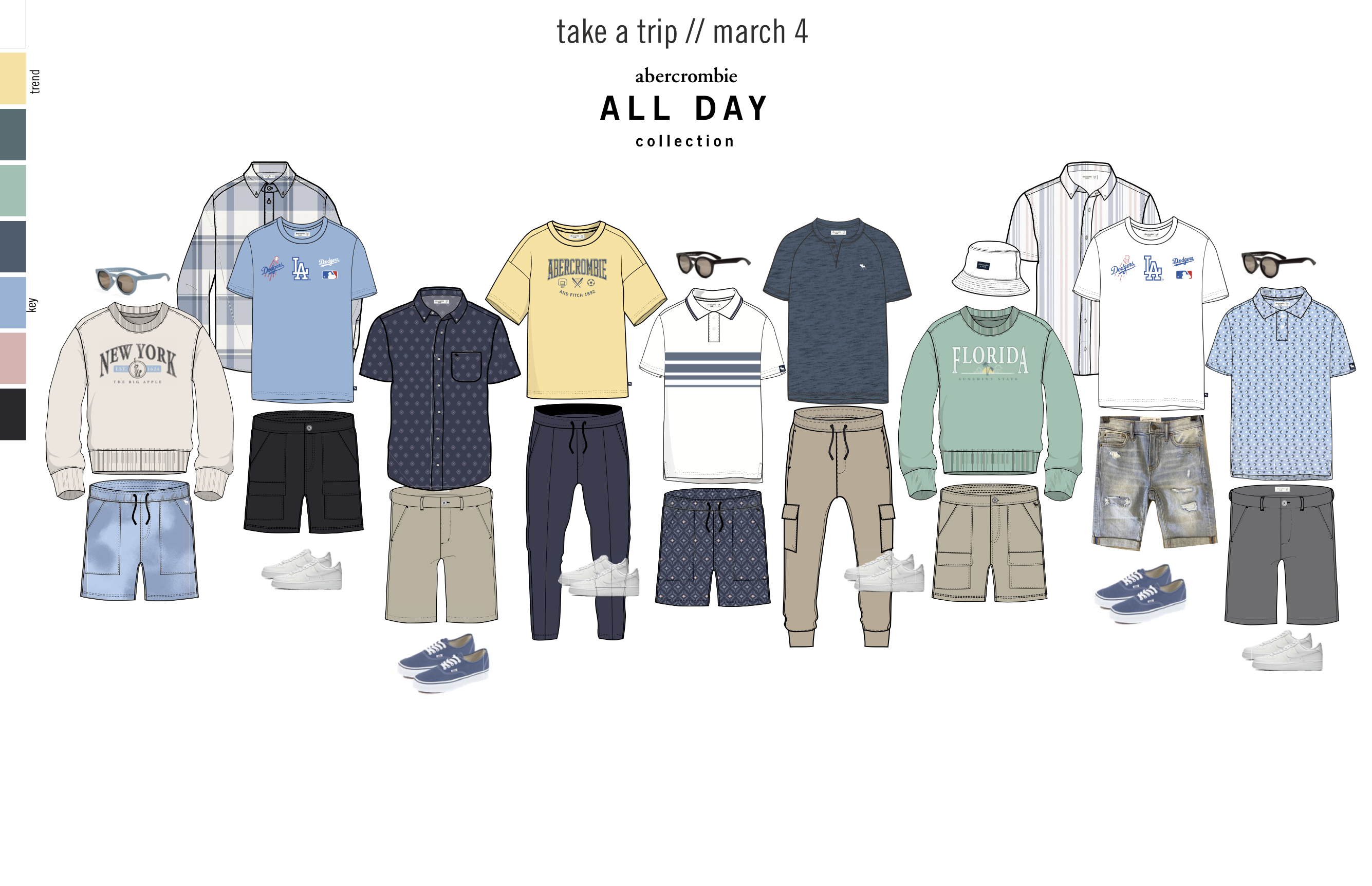 the premise of our ‘All Day’ Collection was to create a focused assortment that utilized super soft cottons and/or functional fabrics in a dressed-up but versatile manner. think golf shorts, button down shirts, henleys and comfy shorts in stretch or active fabrics. we loved taking a preppy angle with trending geos, micro patterns, stripes, and new neutrals. to supplement the ‘All Day’ capsule, we made sure to offer our kid his favorite fleece and tees with a MLB licensing, updated logo layouts and all over patterns. the key outfits page showcases how our ‘all day’ items, trend pieces and casual items can outfit together in a comfy but cool way.
